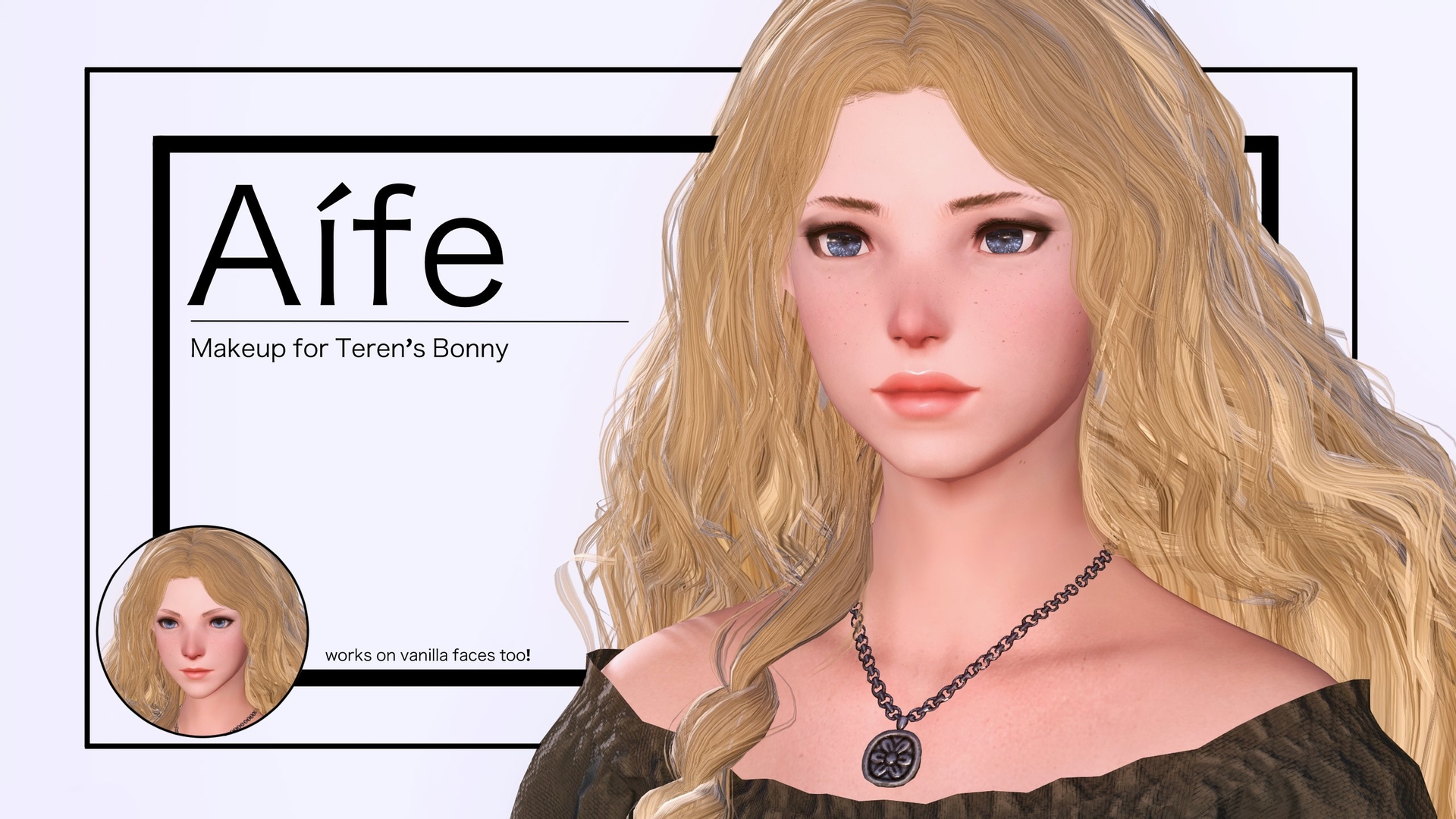 Hello! Long time no mod ^^I've been away playing World of Warcraft for the past half-year, but I'm still finding time for a bit of FFXIV here and there! I recently made this face texture for an OC, and thought I'd share if anyone wants it! I'm absolutely in love with Teren's Bonny, updated for DT uvs by the inimitable Saratonin, and thought I'd make something for it (despite never having worked with midlander faces before aha...) It's a small riff off of the original Natural Lite makeup, with a smoky eyeshadow rather than solid eyeliner and a light scattering of freckles! If sculpts aren't your thing, that's alright! I've included a slightly-edited version for use on vanilla midlander faces. Modpack contains two .pmps: one for Bonny Reborn and one for vanilla faces 2-5. I've also included the loose files, as well as a .psd for each if you wanna toggle off the freckles. Huge thank you to Saratonin for being super cool and allowing me to post this. They're doing amazing work bringing everyone's well-loved sculpts back from the pre-Dawntrail graveyard, and you should check out her stuff!Contributors Yuria for 2K Face DiffuseSquare Enix for Normals, MasksTeren for Original Sculpt & MakeupSaratonin for DT Sculpt & Makeup PortContactBsky: @aellexivDiscord: mnema#mnememods if you would like me to see your oc!