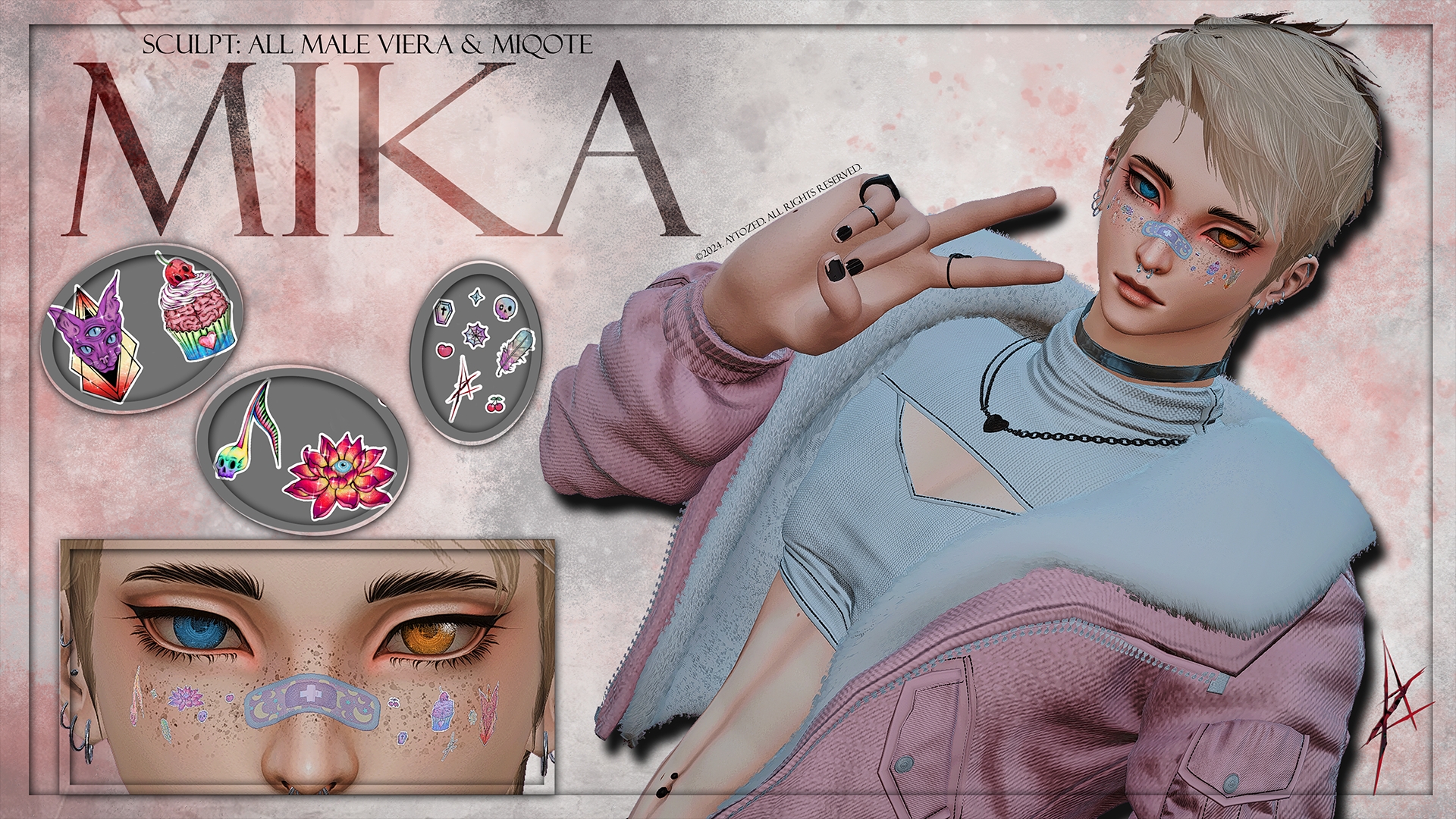 ✧ Hi-Poly Face Sculpt for all Male Viera and Male Miqote faces.✧ Hand drawn eye texture done in Clip Studio Paint ✧ Hand drawn Brows (Dyable and Undyable)✧ Hand drawn Lashes✧ Toggable Hand Drawn Freckles✧ Toggleable hi-poly human ears + New realistic hand painted textures made in Substance Painter✧ Toggleable ear piercings✧ Toggleable septum piercing ✧ Toggleable hand drawn band-aid over the nose (©2024. AytoZed. All rights reserved.)✧ Toggleable hand drawn stickers on face (©2024. AytoZed. All rights reserved.)✧ Chocochomp teeth (All Miqo'tes get fanged Chocochomps.)✧ 2k handpainted make-up texture made from scratch in Substance painter.Zip file:Contains a non dyable version and a dyable version of the sculpt.Disclaimer: • We do have some minor weighting issues on eyelids pertaining to Miqo'te faces 2 and 4 as well as Viera face 1. Due to the nature of the sculpt's rig,(face 3 male Viera as a base), some of the faces tend to overshoot/under perform while closing the eyelids or mess with the lashes in the inner corner.• The neck seam. (Some are annoyed by it while others are used to it.)