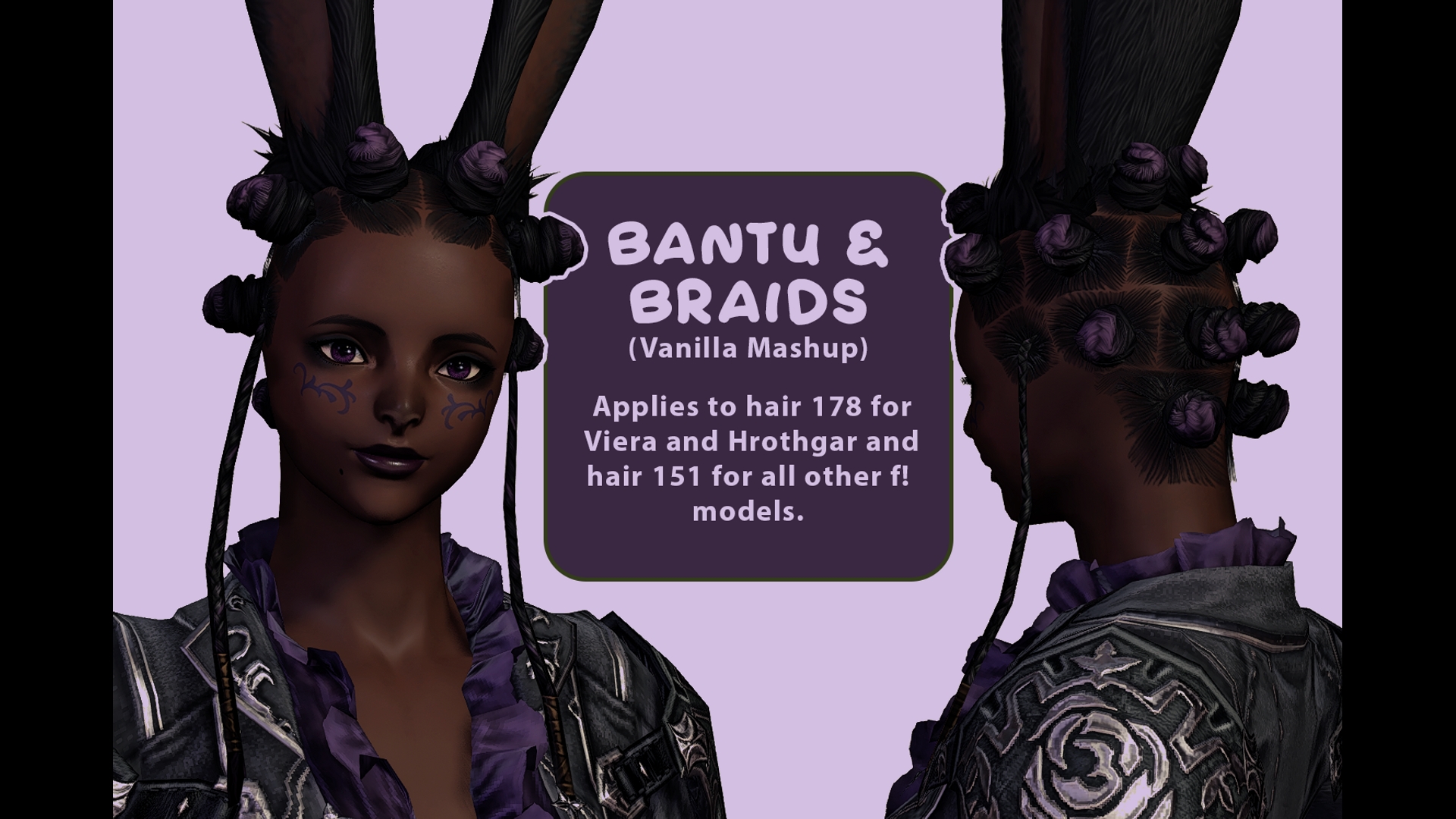 A mashup of m! highlander hair 1, m! Midlander hair 5, and f! viera hair 1, with custom textures aided by brushes by Vegalia.Applies to hair 178 for Viera and Hrothgar and hair 151 for all other F races.This hair is NOT hat compatible.Please see my ko-fi main page for TOS &