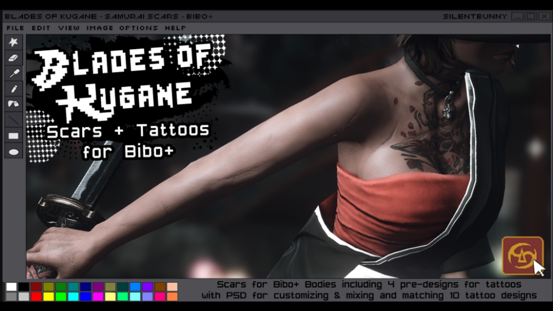 ★⋆︵‿︵‿︵‿︵‿︵‿︵‿︵⋆ ★First in a series of Class inspired scars, influenced by the members of my Discord. Please consider joining!Blades of Kugane is the Samurai inspired scar design, focusing on wounds made by blades and arrows. More images :- https://ibb.co/album/q3zqmD★⋆︵‿︵‿︵‿︵‿︵‿︵‿︵⋆ ★Comes with-▶ .pmp with Detailed & Smooth textures + Buff variants▶ 'Mid-Level' body scarring inspired by the Samurai class▶ 4 pre-designs for tattoos. 10 unique in total to mix and match for a custom look in the PSD. (Only 2 for AuRa due to scales, and none for Hrothgar due to fur, but you can create your own with the PSD if you want tattoos despite the limitations)▶ Transparent .png overlays of the scars ▶ Dev kit also included. PSD files to use in Photoshop to make custom textures. https://silentbunny.carrd.co/#tutorial - for help customising★⋆︵‿︵‿︵‿︵‿︵‿︵‿︵⋆ ★▶ Needs Bibo+ by Illy, Bizu & Tsar in order to work ◀All credit goes to these creators. Please consider supporting them. This mod will effect the B material, meaning that this will appear ONLY on upscaled gear, smallclothes and Emperors set. It will look absolutely janky if mirrored, thus no Mat A is supplied. You are welcome to make your own Mat A if it bothers you.★⋆︵‿︵‿︵‿︵‿︵‿︵‿︵⋆ ★Known Issues -☆ May show seems in the middle of the torso and back, and around the neck☆ Will stretch with bigger body sizes.☆ Transparent normals not compatible with YAB textures due to