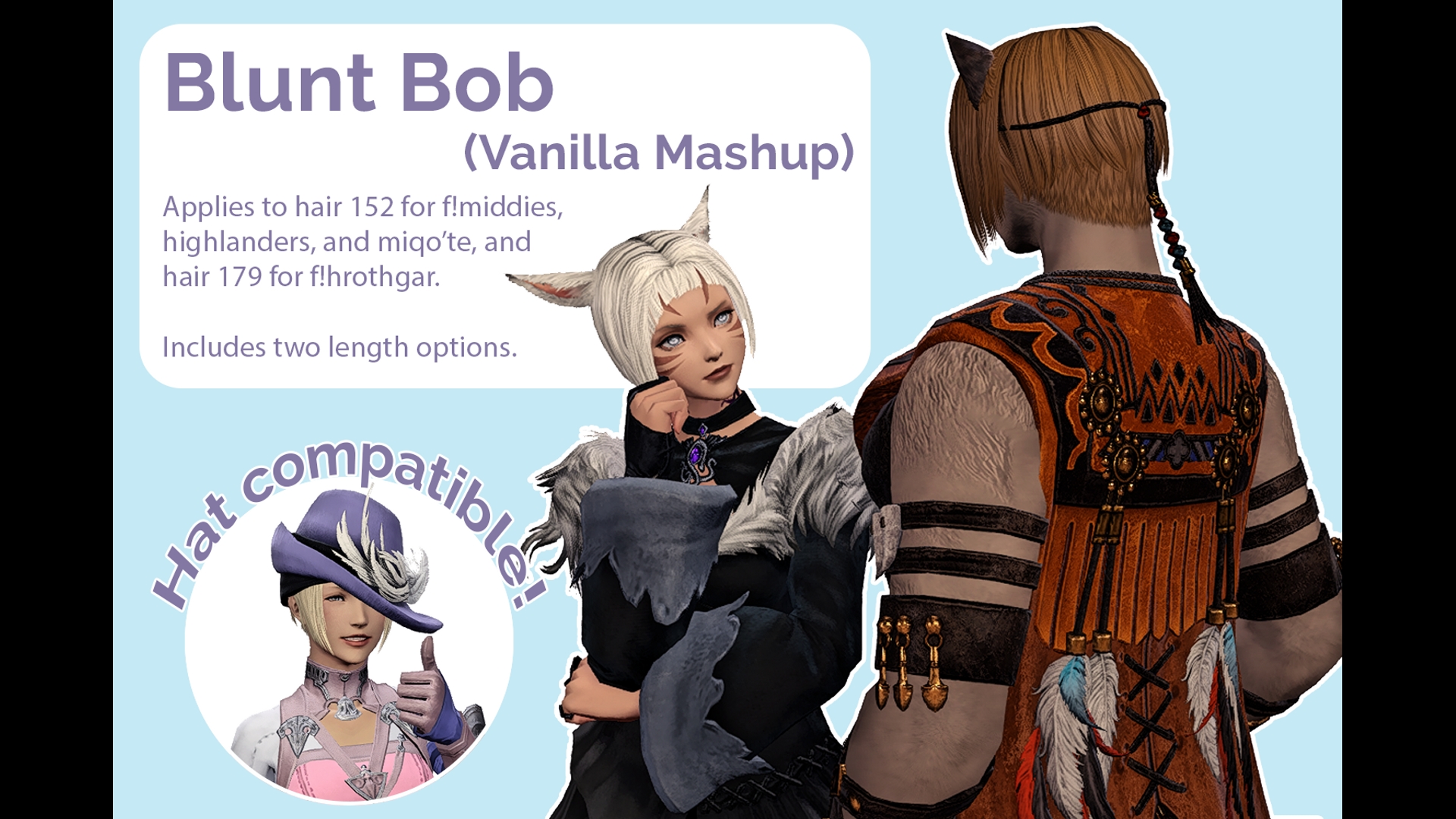 A mashup of Hrothgal hair 13, hair 152, and hair 175.Applies to hair 152 for f!middies, highlander, and miqo'te, and hair 179 for f!hrothgar.Includes two lengths: mid cheek length (short) and chin length (long).This hair is mostly hat compatible.I say mostly because I do not have hats for hrothgals so could not test compatibility for them; however the hair inherits the shape keys from the miqo version so it may work with hats.Please see my XMA profile/ko-fi main page for TOS &