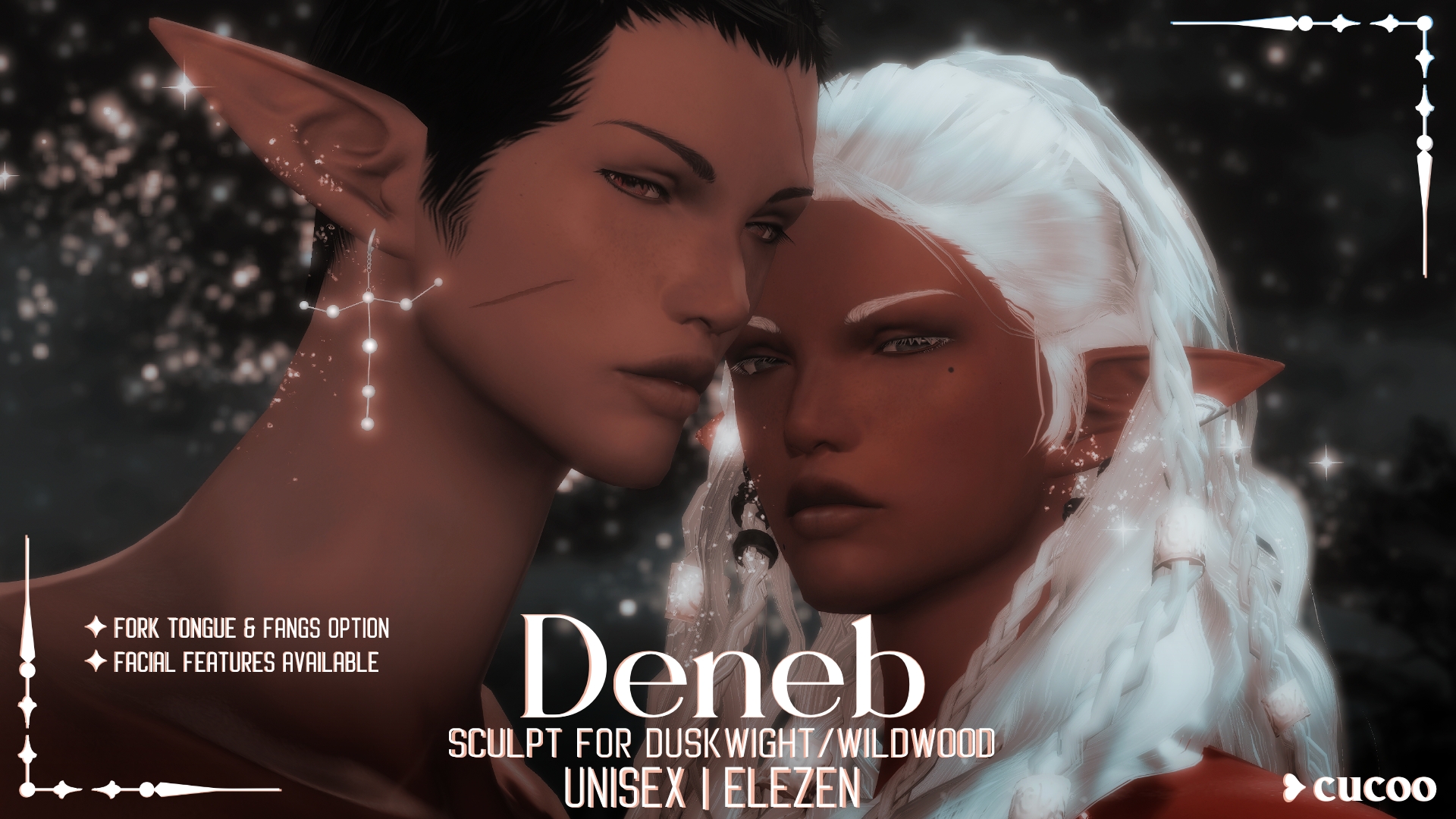 sculpt for face 3 duskwight and wildwood masc and femme models!notes⟡ m face 3 is the base for sculpt w/ m viera face 1 lashes on ect_c⟡ f model port is a auto-conversion with manual adjustments hopefully for better compatibility⟡ makeup is EW sitch retexture updated for DT and combined with the current 2.2ver, then adjusted for both m/f sculpts⟡ options for fangs and/or fork tongue shapekeys⟡ dyeable or black lashes toggle⟡ vanilla brows used are adjusted to be thicker⟡ share male duskwight scar placement for all faces⟡ m model has duskwight beard options for both⟡ f model has wildwood moles for both⟡ both retain their respective duskwight pattern options and wildwood clasp options⟡ other than ears, face shapekeys are disabled⟡ eyes closed are a bit wonky⟡ minor seamswhile my work is not completely perfect, I hope it's still enjoyed!Thank you ♡extra: the cygnus/northern cross earring is private-- super sorry! it is remin777's earring, pleiades, edited for theming in the preview__