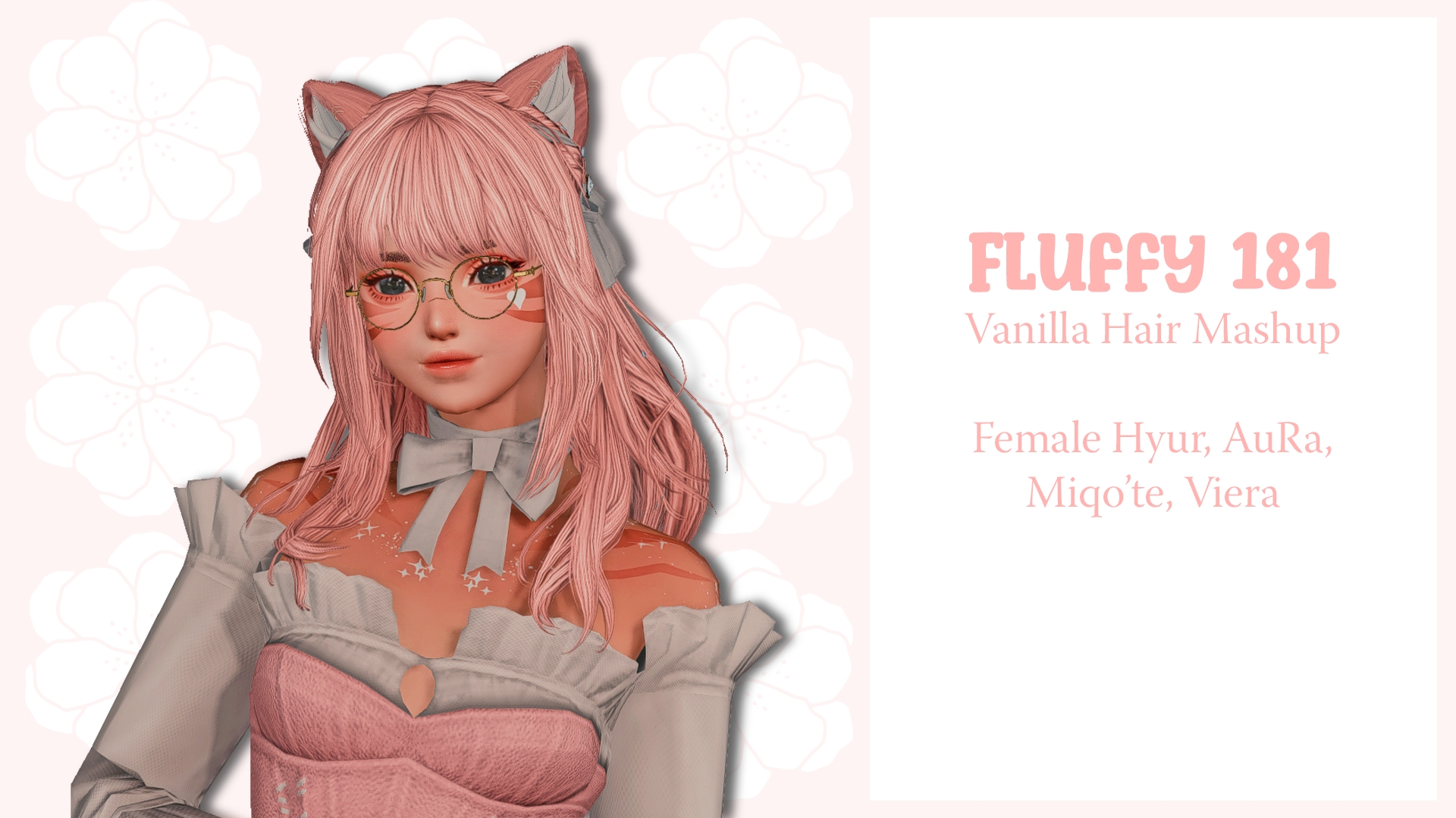 A Vanilla Hair Mashup !Mostly an edit of hair 181 to make it more fluffy !removed the flowersReplaces hair 181For Fem Hyur (Midlander and Highlander), AuRa, Miqo'te, VieraHighlight CompatibleHat CompatibleVanilla and Earless Miqo'te Ears options(There may be some clipping with AuRa horns ! I do my best to try to minimize it but some clip more than others, I apologize !)use #guavaxiv on twitter !-