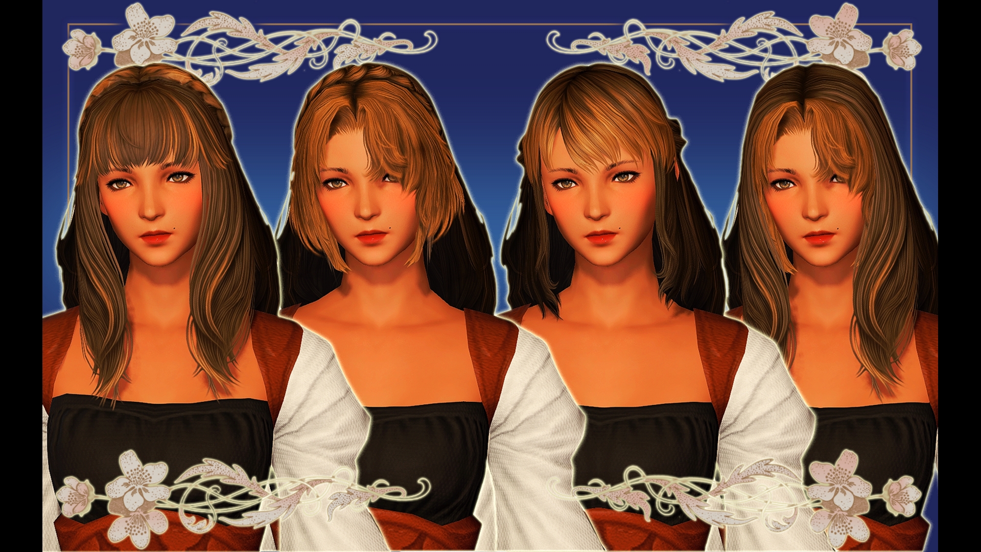 A vanilla hair mashup for (F)Midlander ONLY. Replaces hair 162. Not hat compatible.Vanilla highlight compatible.!!! SELECT ONLY ONE OPTION AT ANY GIVEN TIME !!!An assortment of long hairstyles with varying braided fashions. In this pack there is:- A long hairstyle with a Dutch crown braid. - A long hairstyle with a double braid pulled to the back of the head. - A long hairstyle with a braided headband.- A plain, long hairstyle with no braids. Hairs with bows are toggleable, as well as dyeable through Advanced Edit (bow is on hir_e).
