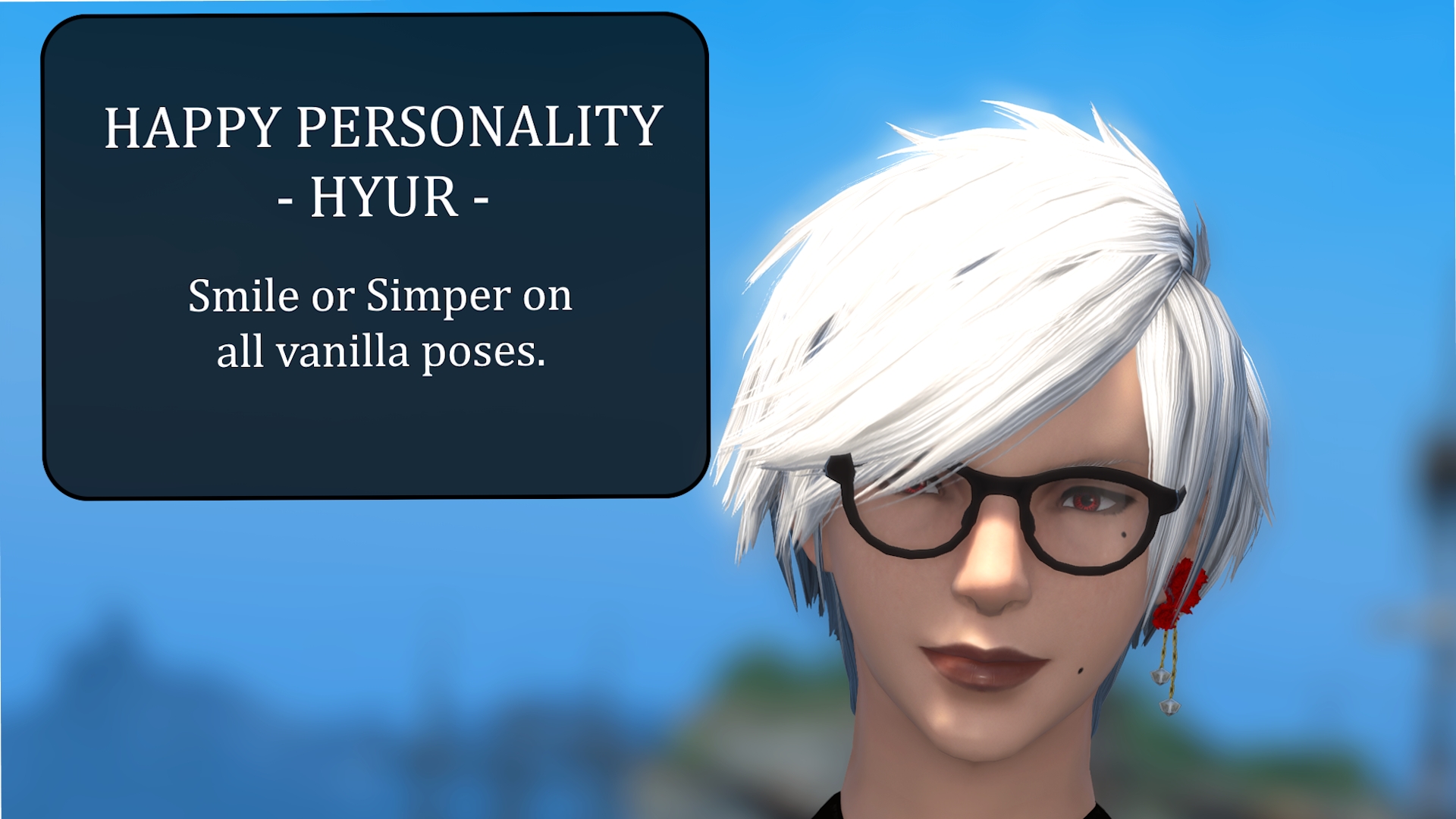 • Adds either the Smile or Simper facial expression to all vanilla poses. You can toggle them individually.💝 Why does this exist? 💝• The existing "Permanent Facial Expressions" mod completely locks your expression until you do /straightface again. If you want to constantly smile with that, face movement on all other emotes will be broken. For example you will laugh with your mouth closed and no face movement.This mod fixes this and only does the expression on the idle poses.💝 Usage 💝• It is recommended to set the priority of this mod to -1 (with the minus) to use it as a baseline. This way other idle mods will overwrite it.💝