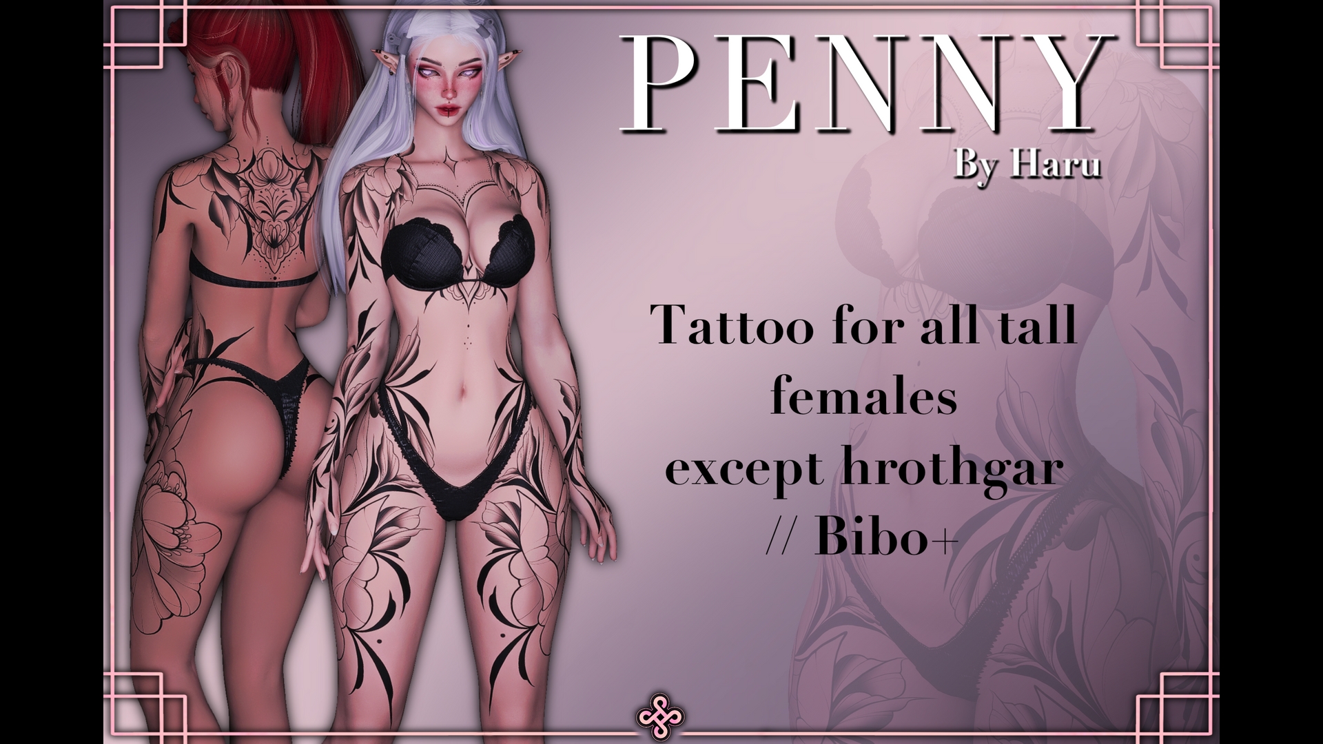 Handdrawn Tattoo for FFXIV▃▃▃▃▃▃▃▃▃▃▃▃▃▃▃▃▃▃▃▃Comes with:- All Bibo+ maps except Hrothgar (Basic Bibo texture, Scaleless Raen, Au Ra -Vanilla + B/W scales, Selene Scales+)- 4k + 2k Overlay maps- .pmp mopdpacks for all (except hrothgar)▃▃▃▃▃▃▃▃▃▃▃▃▃▃▃▃▃▃▃▃General