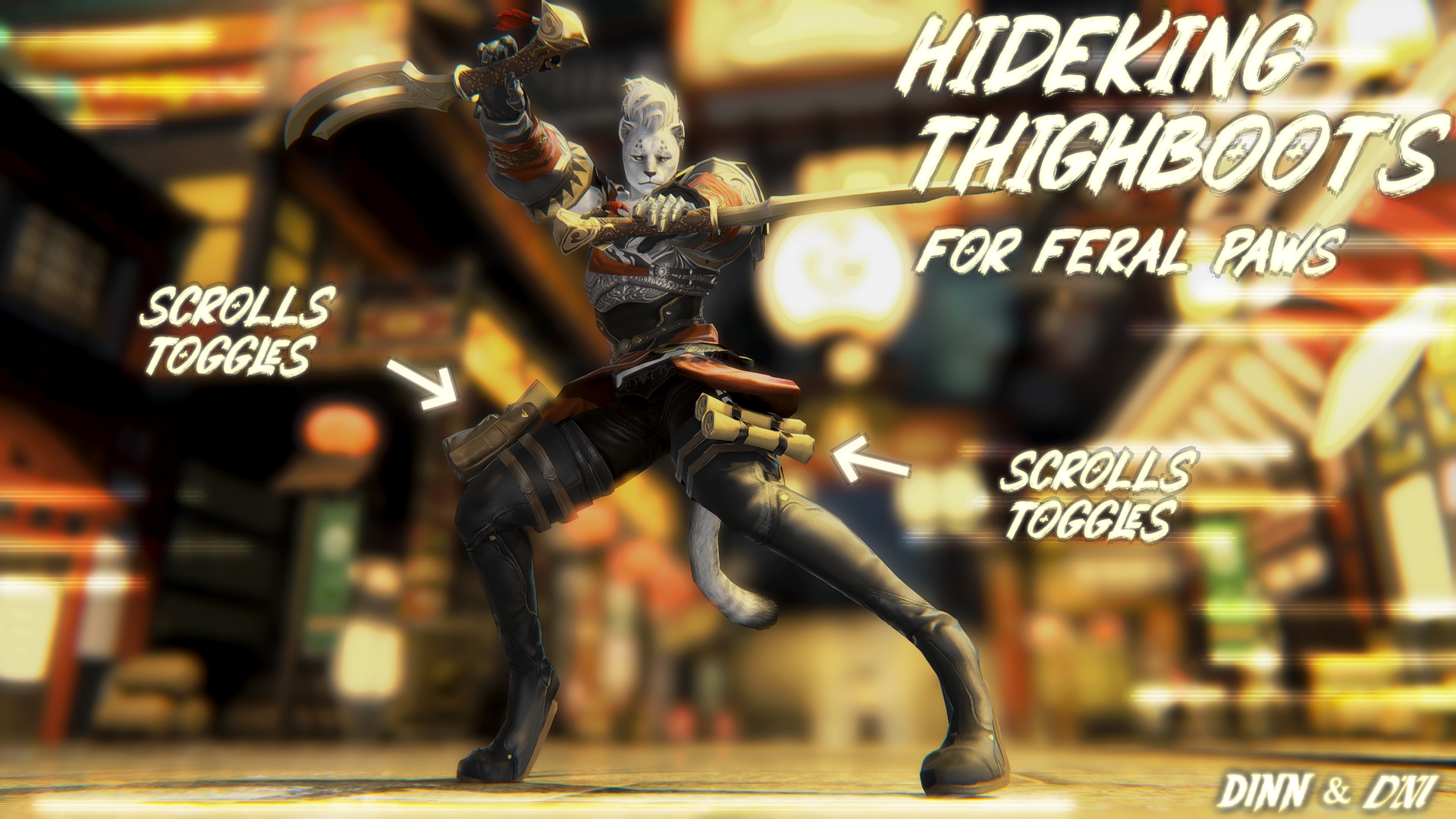 ABOUTPort of Hideking's Thighboots to Feral Paws. Supported for all tall Midlander-based races. Removed the Side-bag, added Scroll Toggles. AFFECTS- Hideking's Thighboots.DEPENDENCIESRefer to Crow's Feral Paws for all dependencies and
