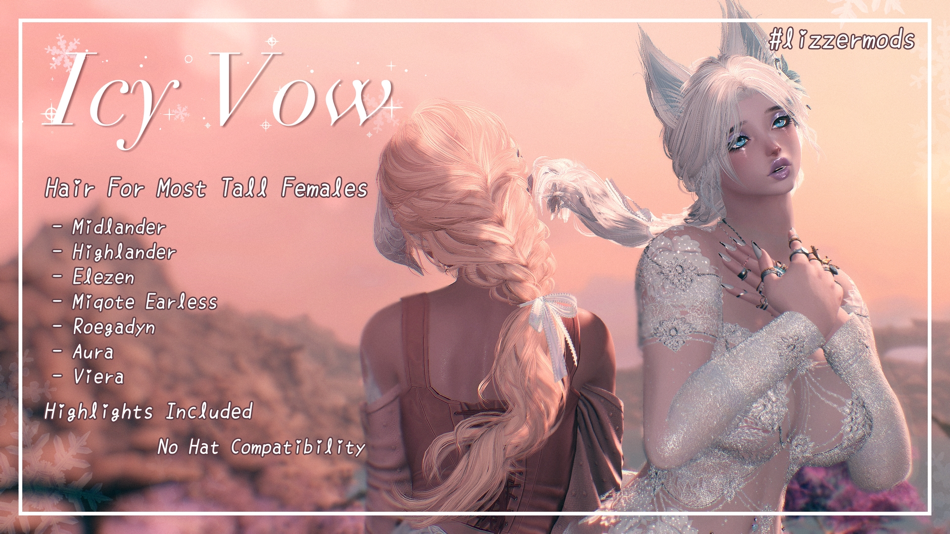 Part 1 of 5 of my Vow collection of hairs ♥ Each one will be released as they are completed!No hat compatibility, includes models for all tall races (excluding Hrothgar :c I'm sorry!!!)Want me to see your gposes? Use my hashtag: #lizzermodsMiqote w/ vanilla ears port by themoyouknow: https://www.xivmodarchive.com/modid/143468