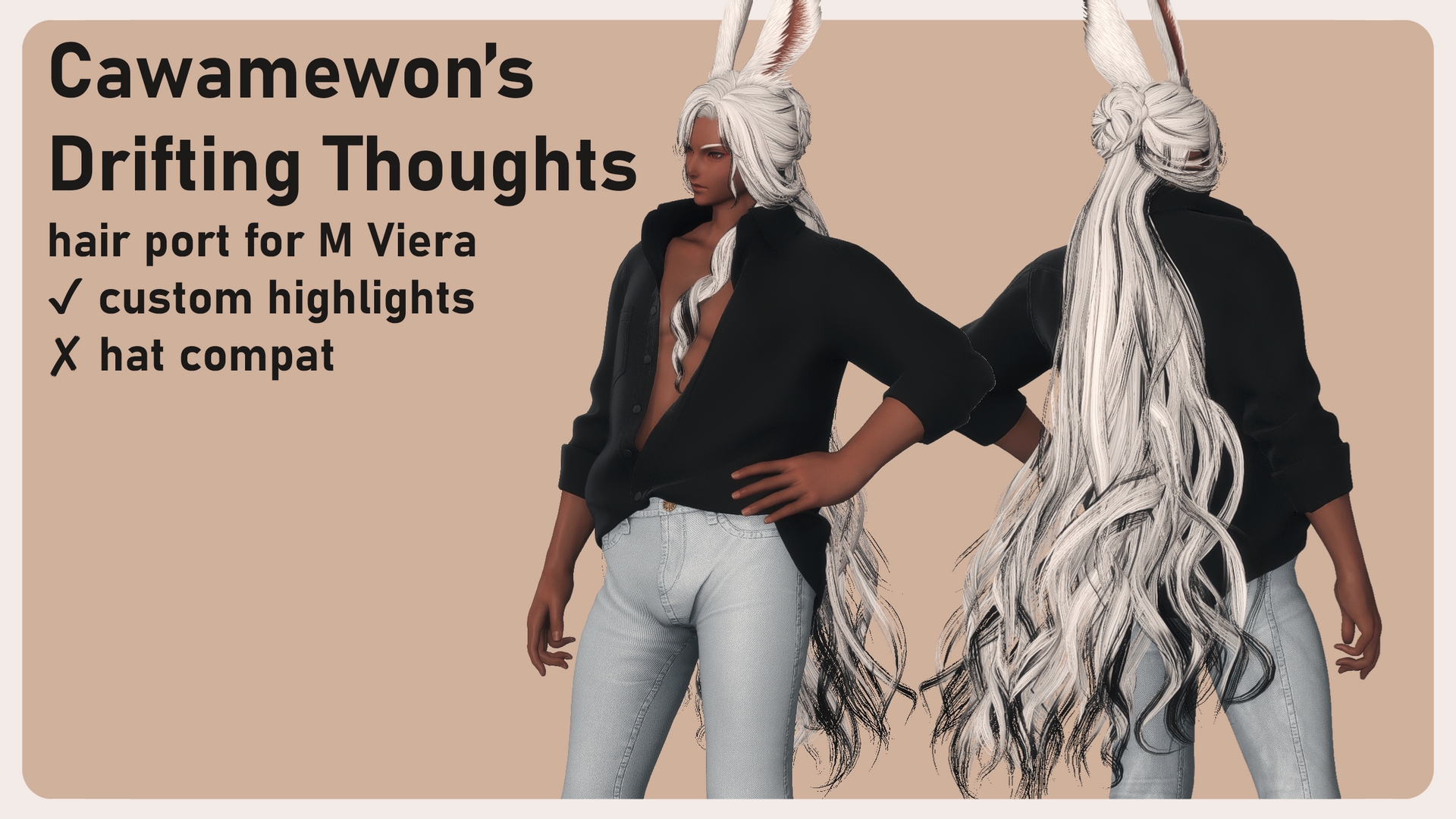 Port of Cawamewon's Drifting Thoughts for Male Viera.Includes custom highlights, but no hat compatibility.Retains the same posability as the original.Original mod (not required) here: https://www.xivmodarchive.com/modid/136570Cawamewon's
