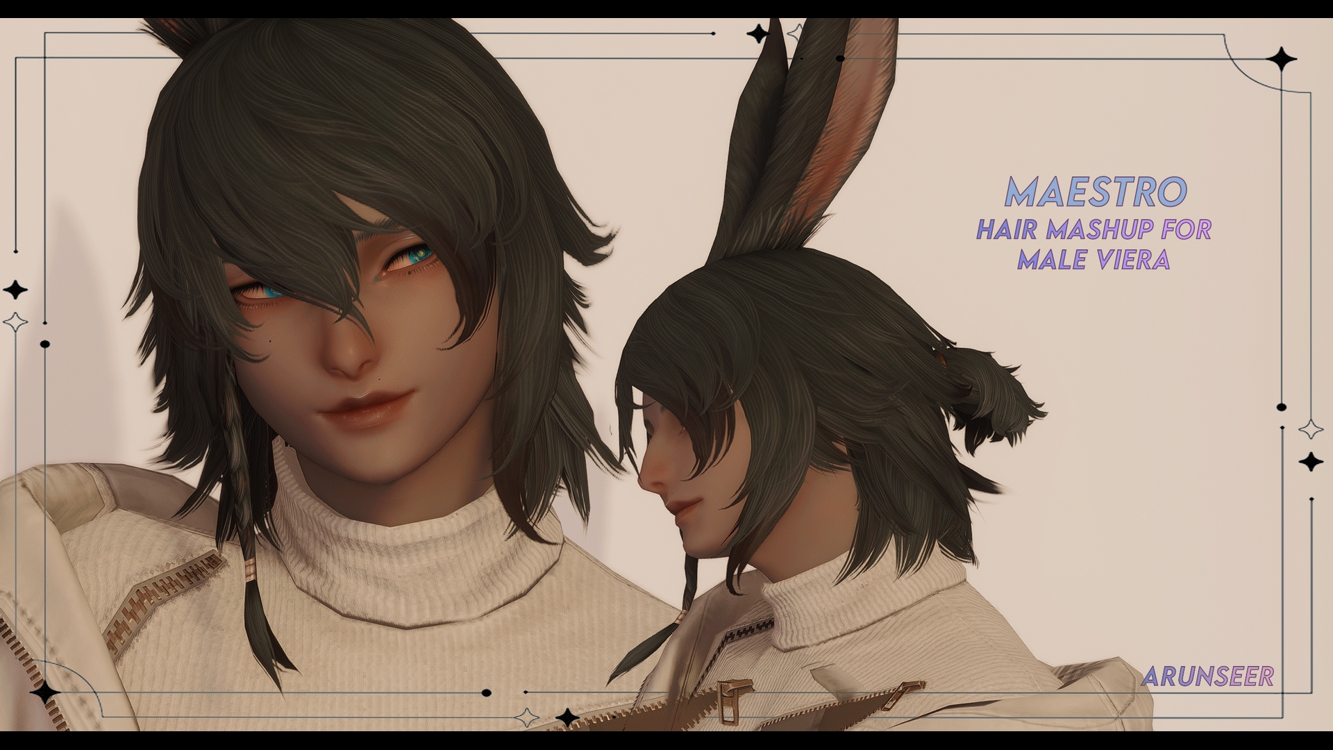 I wanted a slightly fluffier half up hair <3 As always expect a little Funk™️I will fix it ONE DAY. for now it works for what i wanted :)))→ Affects Male Viera Hair 1→ NOT Hair compatible→ uses parts from : mviera hair 1, mviera hair 15, fhroth hair13 and mhyur 122⚠️