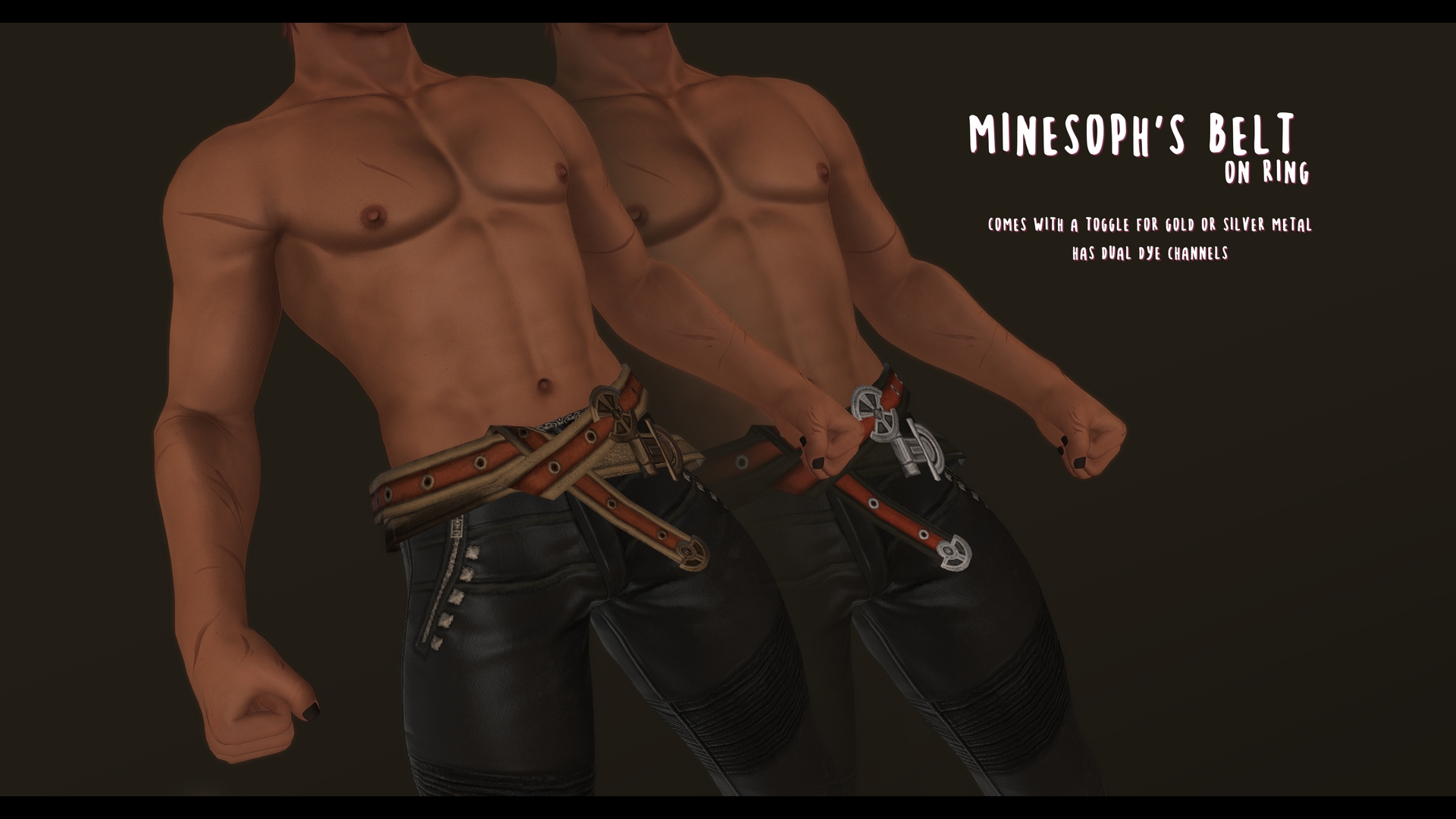 Belt ripped from the Minesoph Top - with some tweaked textures, bags removed, and holes from messing with it patched up a bit.On the Althyk Ring (Right Side).By the nature of being a ring can technically be worn by everybody but also by the nature of being on a ring, clipping will happen with non-vanilla proportions (Big Butts, Hips, The Things It Is Doing To MHroeths and Lalas) and I cannot help that. Sorry!UPDATE 1.2: Now with proper M!Hroth/Roe and Lala Models! Yippeeeee!!!! Go and be free!As an On-Accessory it'll also clip with things so sorry for that too.Comes with a gold and silver metal toggle and has dual dye channels.