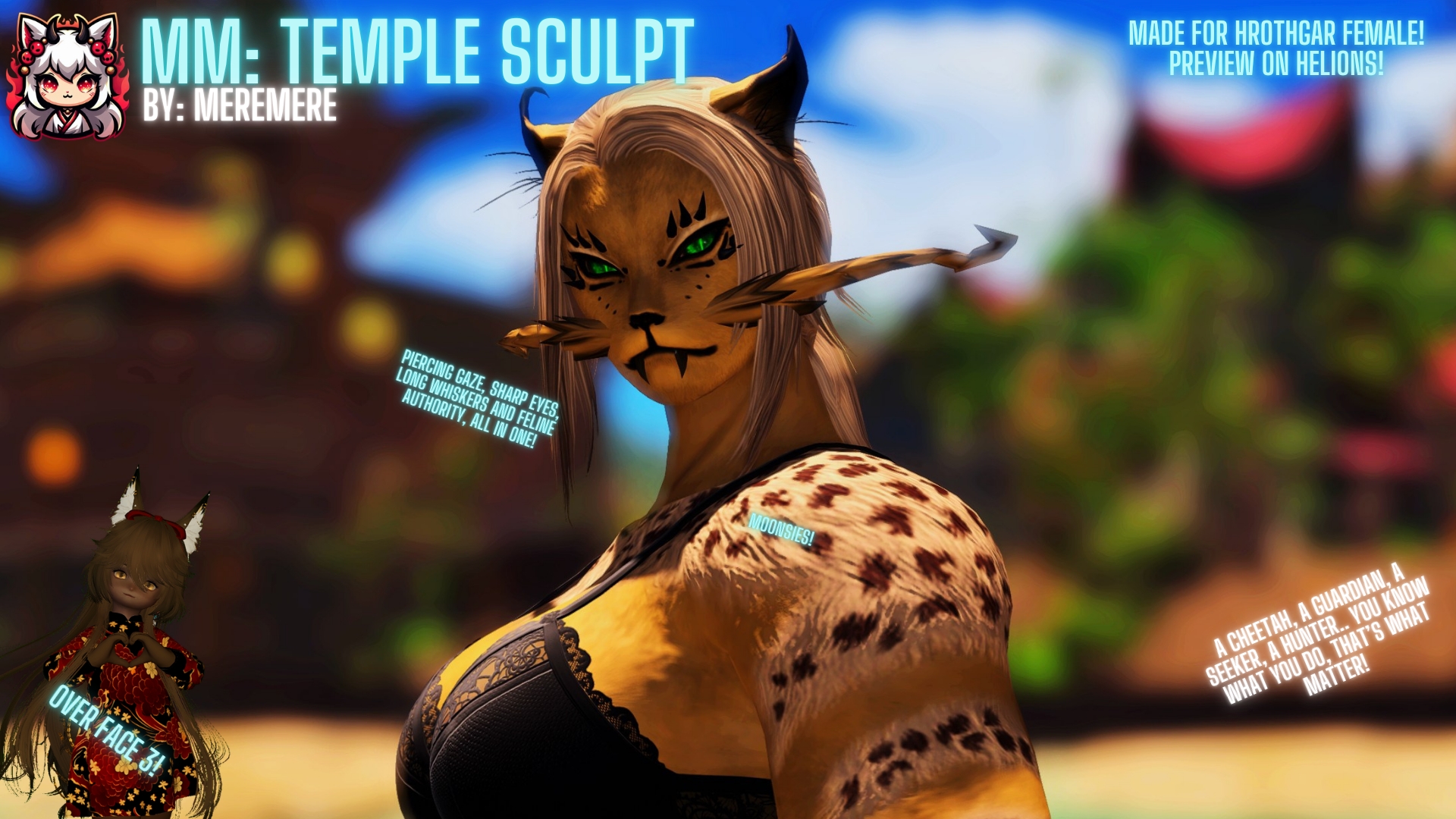Temple is a sculpt that i planned right after Shrine, and is quite different from my first ideas! So, here you go with, indeed, Temple! It is a pretty simple sculpt a little closer to it's vanilla counterpart, and is basically a sorta Cheetah/Coeurl looking face. I modified everything on the facial features, whiskers, ear fur, spikes and the ears too.It have 2 options for the amount of whiskers you wish, 2 or 4, and each of them have 4 makeups you can choose from! The most simple one being Makeup 0 that touches only lips and nose, to the most invasive and, how i like to say, LORE ACCURATE! Ones, being the Tribals.It is a pretty nichè sculpt i am aware, same for Tribe (Hyena sculpt) , but it is what it is and i hope you'll enjoy this sculpt if is what you are looking for ♥For pure fun you may find some little 'lore' info in the sculpt option, because i like to scribble a bit! Enjoy!Little annoyance: The neck seam is sadly visible, apologies in advance ! ♥