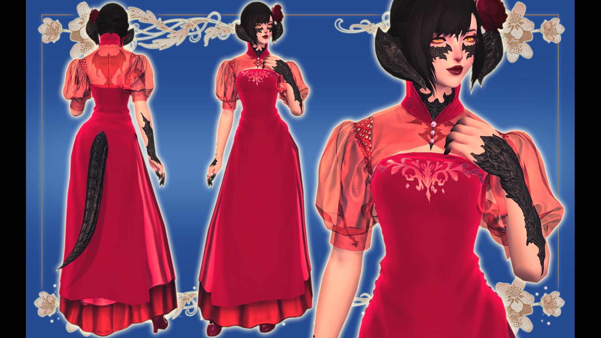 A modern/non-traditional áo dài made for Tracey's character, Peony. As always, please be respectful of this attire.For (F)Talls Midlander, Elezen, Miqote, Au Ra, and Viera.[1] Chest piece: Ao Dai☆ Channel 1 dyes the sheer bolero, sleeves, chest embroidery, side laces, and underskirt.☆ Channel 2 dyes the collar and tunicIssues & Notes:• May be some clipping in the front and back of the chest with certain models, idles, or poses.• May create odd shadows on the chest due to the transparency during certain times of day or lighting.• May be some clipping with extreme poses and animation. • May be some clipping with the tunic and skirt.• Sculpted primarily for vanilla size & shaped bottoms. Should work well with moderate-sized pants/skirts, but you will certainly find clipping with larger/bulkier bottoms and pants. • If you would like to port this to other bodies*, feel free to!*No Eve, Apres Moi, Kitten, etc.• Comprised of: Ovelia, Obsolete Casting, Lunar Envoy, Anabaseios Healing (legs), Eternal Devotion, and Halmarut's attire.• Due to scaling of the bust, some races may work better than others. While the dress works for all races, Highlander, Roe, and especially (F)Hroth suffer the most clipping, so they will not be listed. • Please treat this attire with respect. Do not edit it to sexualize it, do not use it for orientalist imagery.☆ ☆ ☆Perms• Other creator/collaborator