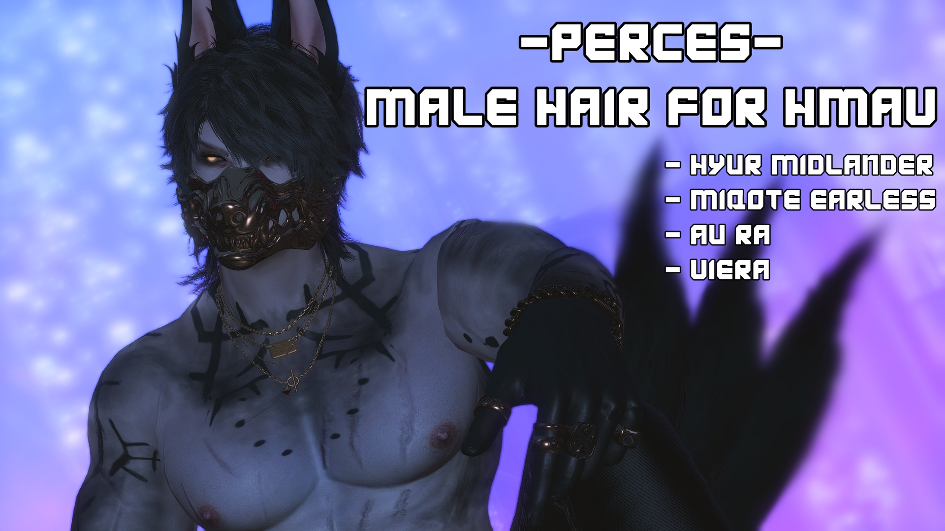 A quick and dirty port of Caleb's Hair from Tainted Cuts ♥ Weights are not perfect, but I plan to fix them at a later time.Includes the following races (Hair 122):MidlanderMiqote (Earless Only)Au RaVieraCurrently not hat compatible, I'm sorry! I like these hairs a lot, so I will add more to them as I work on this port.GET THE MATCHING OUTFIT HERE: https://www.xivmodarchive.com/modid/130573