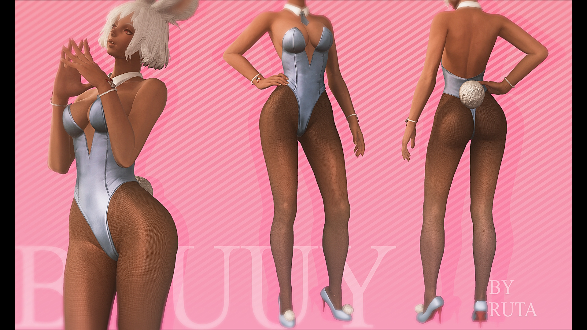 A simple bunny suit for Bibo+. Includes a bracelet, the suit, ears and shoes.Comes with two different modpacks; one has a darker mask for a pure black, and the dyeable version has a lighter mask, for those of you who wish to dye it. This will hide any leg gear you may equip. It is long glove and long boot compatible.Note: This mod uses BIBO+ XL (Push Up) with the skin on Mat B. There is no current support for GEN2.Perms: Bibo+ size edits are allowed for personal use. Do not republish or redistribute without asking permission first.Follow my Twitter for modding updates, suggestions etc... https://twitter.com/rutamodsLinks, Commissions,