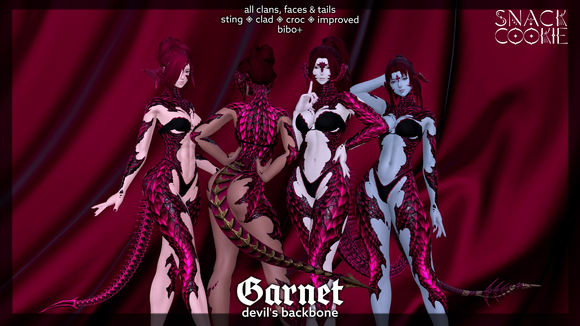"This is a new year. A new beginning and things will change."This is the first scale set within my Birthstone series where once a month a birthstone (since each month technically has several) is voted upon in my server the previous month and I create a scale set inspired by the stone itself and ideas given by the community. Garnet won out for January! I hope you enjoy this set of scales inspired the various warm hues within a red Garnet.THOSE IN PREVIEWS (in order for WCIF purposes):Anaya (@anaya.san)Cota (@cotabean)Matilda (@justdegenerate)Kazumi/Rumi (@sugarbabyriot)Starr (@xxstargoddessxx)Caur (@caurnflakes)Noelle (@osii)IMPORTANT Skin tone plays a vital role how colors show on skintones. Lighter skin tones, depending on the colors, will wash them out a bit and make them more white. Keep this in mind when trying out scales!!All original mods are required as this just contains diffusesDevil's Backbone by BMM: https://www.xivmodarchive.com/modid/121137Sting Tail by WLT: https://www.xivmodarchive.com/modid/110940Improved Tail by WLT: https://www.xivmodarchive.com/modid/110364Croc by WLT: https://xivmodarchive.com/modid/110939Clad by WLT: https://xivmodarchive.com/modid/126199You can find Transparents on KofiLink: https://ko-fi.com/s/ba89382eb2If you need any help with my mods, WCIF from the previews, join a great community, see future projects, booster perks or possibly even want a commission, it can be found in the Snack Shack!Discord link: https://discord.gg/snack-shackUse #cookiemods for me to see all your beautiful OCs!!