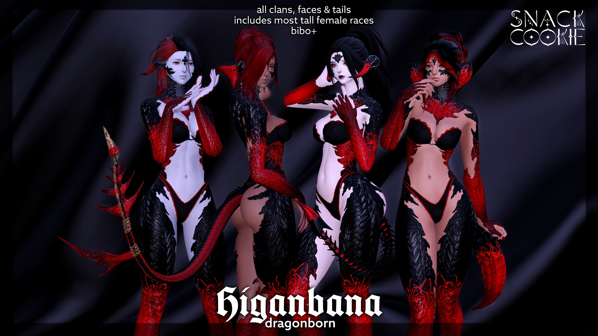 "Death is not the greatest loss in life. The greatest loss is what dies inside us while we live."This set was a commission that is now going public! The idea is based around September Morning Flower, also known as a Higanbana or Spider Lily. These flowers represent death, separation and the afterlife. The idea was to basically have death slowly blooming across the body. This is for all tall female races minus Hrothgar.THOSE IN PREVIEWS (in order for WCIF purposes):Beans (@feral_bean)Caur (@caurnflakes)Bea (@beatrix)Cota (@cotabean)Kazumi (@sugarbabyriot)Starr (@xxstargoddess)IMPORTANT: Skin tone plays a vital role how colors show on skintones. Lighter skin tones, depending on the colors, will wash them out a bit and make them more white. Keep this in mind when trying out scales!!All original mods are required as this just contains diffusesDragonborn by BMM: https://heliosphere.app/mod/q893n92ct517kbe862g9rgtg1gScaleless Dragonborn: https://www.xivmodarchive.com/modid/148781Sting Tail by WLT: https://www.xivmodarchive.com/modid/110940Improved Tail by WLT: https://www.xivmodarchive.com/modid/110364More tails will be added at a later date!If you would like transparents they can be found on Kofi (free)Kofi Link: https://ko-fi.com/s/dd0e3bd7c6If you need any help with my mods, WCIF from the previews, join a great community, see future projects, booster perks or possibly even want a commission, it can be found in the Snack Shack!Discord link: https://discord.gg/snack-shackUse #cookiemods for me to see all your beautiful OCs!!