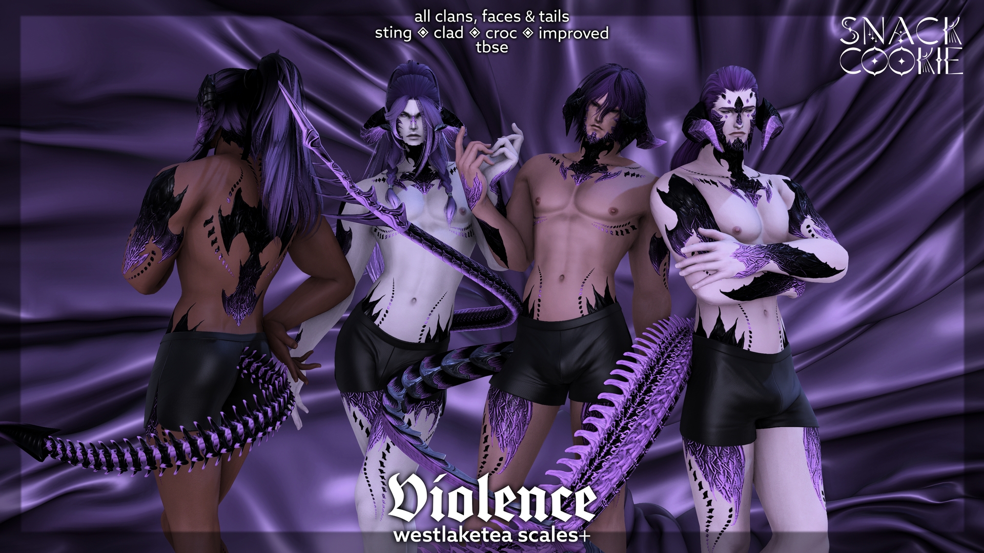 "Violence, remember it's only the body that is fragile. You are unbreakable."This set of scales was inspired by a character from the Empyrean Series commissioned by a lovely bean who wanted to have a bit of Violet Sorrengail with her. Thank you so much to Star commissioning these!THOSE IN PREVIEWS (in order for WCIF purposes discord in top corner):Bean (@feralbeanUlv (@arachniflora)Vicente (floridamanxan)Gik (@gikkers)IMPORTANTSkin tone plays a vital role how colors show on skintones. Lighter skin tones, depending on the colors, will wash them out a bit and make them more white. Keep this in mind when trying out scales!!All original mods are required as this just contains diffusesWestlaketea Scales+ By WLT: https://www.xivmodarchive.com/modid/113146Sting Tail by WLT: https://www.xivmodarchive.com/modid/110940Improved Tail by WLT: https://www.xivmodarchive.com/modid/110364Croc by WLT: https://xivmodarchive.com/modid/110939Clad by WLT: https://xivmodarchive.com/modid/126199You can find Transparents on KofiLink: https://ko-fi.com/s/2ecaacf1b6If you need any help with my mods, WCIF from the previews, join a great community, see future projects, booster perks or possibly even want a commission, it can be found in the Snack Shack!Discord link: https://discord.gg/snack-shackUse #cookiemods for me to see all your beautiful OCs!!