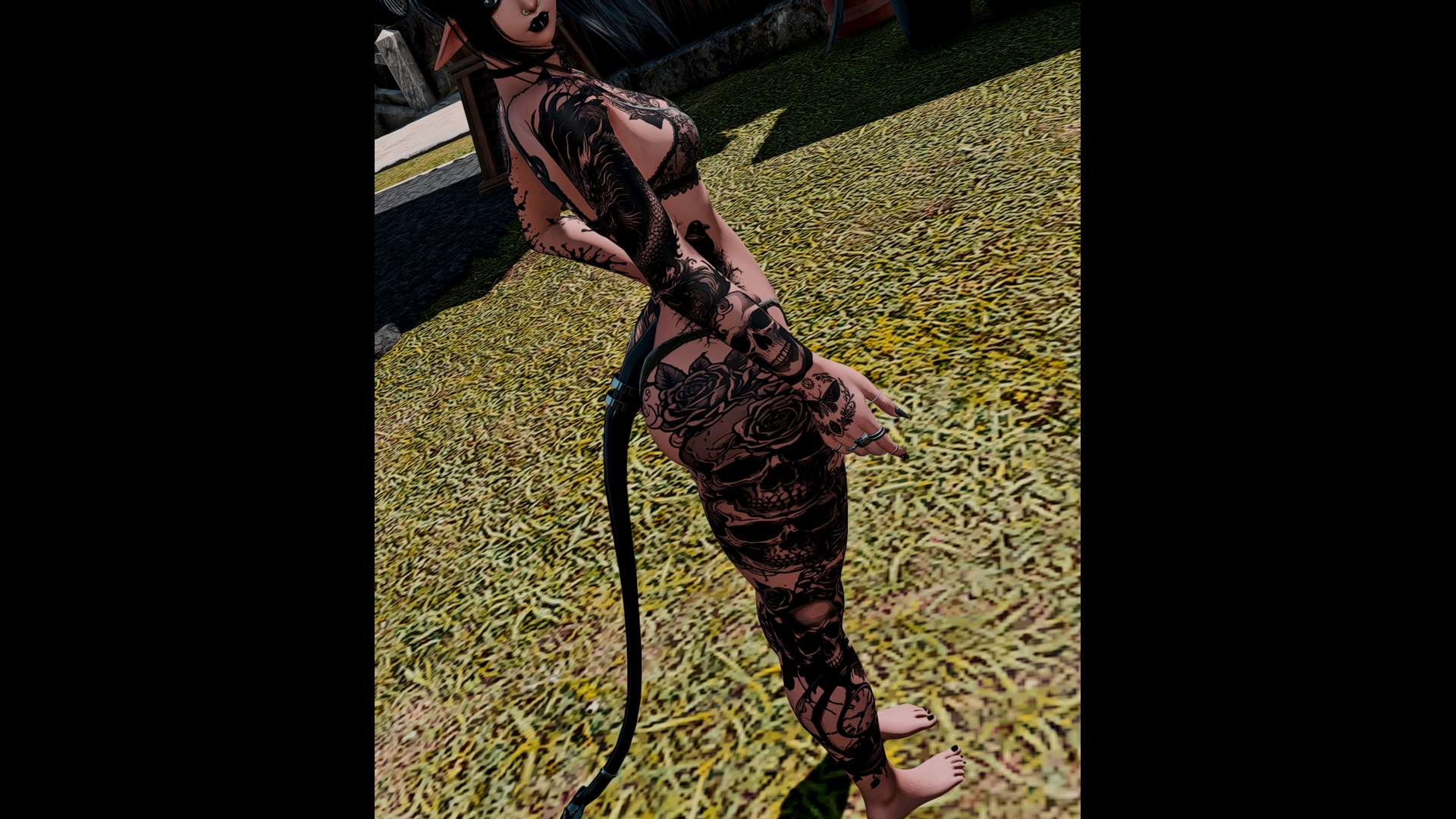 A full body, black ink tattoo. Works for Female Mid/Highlanders, Viera, Miqo'te, Elezen, Aura (scaleless).Created for Bibo based bodies, untested on lavabod, larue, yab, but should work, with minimal effort.