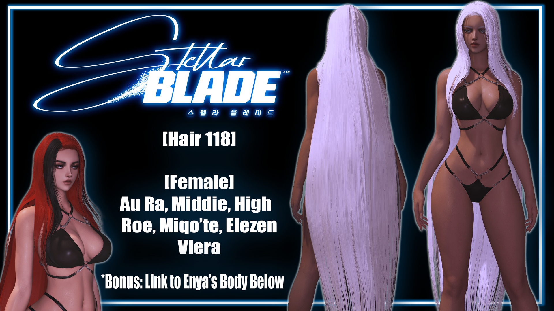 Enya's Body by sketch9echo : https://www.xivmodarchive.com/modid/143136Effects: Hair 118Races: All BUT Hrothgar and Lalafell.Highlights: Yes, just a "skunk" bang.Hair is shown on a viera in previews.THINGS OF NOTE:-The bangs may clip on different chest types, customize scaler types, etc. You can pose the bangs out of the way when in gpose using your preferred posing program, or even C+ the hair if you prefer I am sure!-Due to limitations of bones we have available, the hair won't flow 100% perfectly on the longer portion.-Hair is picky towards MXAO in shaders.-There is some small clipping of the hair on the top of the head - this seems to be a mesh issue.-