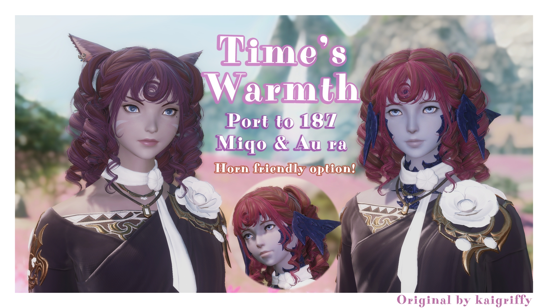 Time's Warmth from Infinity Nikki ported to Miqo and Au ra fems.◆ Goes over hair 187◆ Yay highlights◆ Nay hats◆ Au ra version has a horn friendly option, I modeled it for f2 horns since that's what I use but it looks fine for the others as well.◆ Added an extra curl to where the human ears should be on the miqo version cause the human ear hole looks kinda weird idk. I didn't add a toggle cause I didn't feel like it.◆ Also the miqo version has some tweaks made because the pigtail clips right through the ear so I had to move it a lil. In case it looks weird, thats why.◆ Note that it breaks the textures on the other 187 models (hyur, roe, etc) cause I messed up the install and I really didn't feel like fixing it. Sorry my bad.