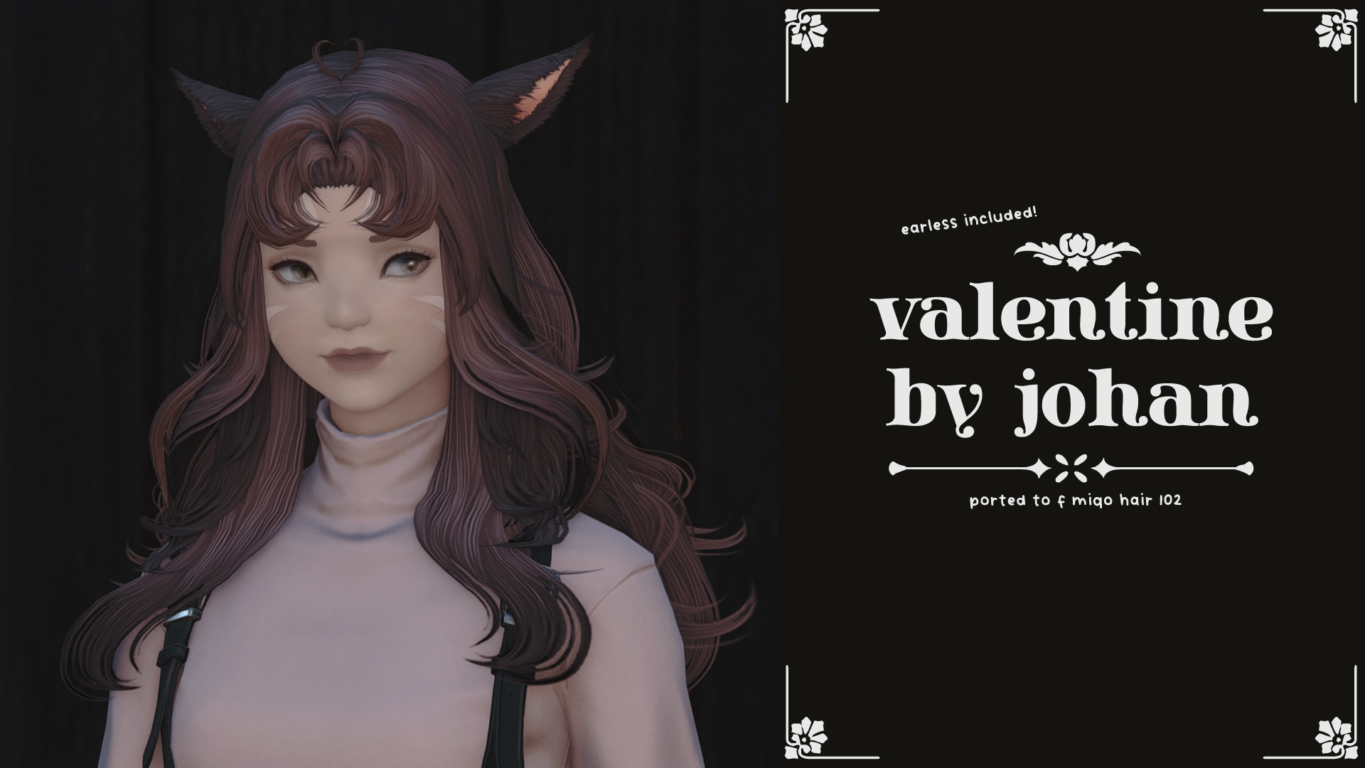 vanilla mashup port for f miqo hair 102···· INFO ····hi isnt this hair beautiful!! ported it to miqo (inexpertly)...i'm not the best with hair still but i realised the only way for me to win is to keep doing it :') please let me know if you find any issues! i reduced the size of some of the textures to try keep the file size down, i hope this hasnt made anything too crunchy!— options for earless + ahogeless models— expect clipping, gaps and some general wonkiness. be careful in extreme poses!···· REPLACES ····f miqote hair 102···· CONTRIBUTORS ····SE for the vanilla assetsJohan for the original hair! (@johan525 on bsky)https://trello.com/b/LMz5u9hs/johan525······················································································································································