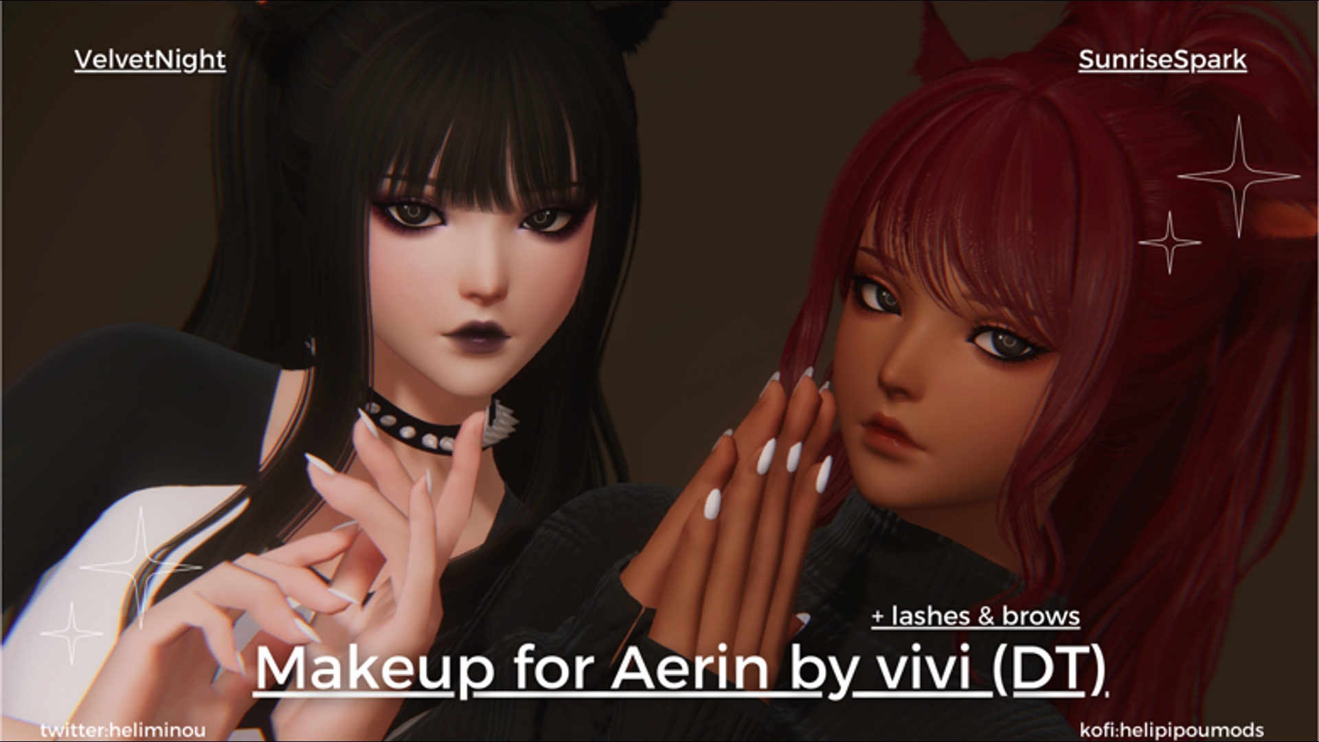 ✨ Hello! A complete rework of one of my first makeups for Aerin : New Modpack Included!!📦 What's inside:Brows & Lashes (only works for Aerin, but feel free to ask if you'd like it for another face!).Modpacks makeup for Miqo'te, Au Ra, and Viera.Loose files for all faces, + loose files for brows/lashes.🐉 Au Ra Options:Vanilla scale colors Black & white scales Or go scaleless for a clean look ^^Universal MakeupThis makeup works across other sculpts! Tested on Vivi sculpts Marie and Emi, but it can also work on all faces. While I haven't checked it on other vanilla races or sculpts, it should still work beautifully! 🌸