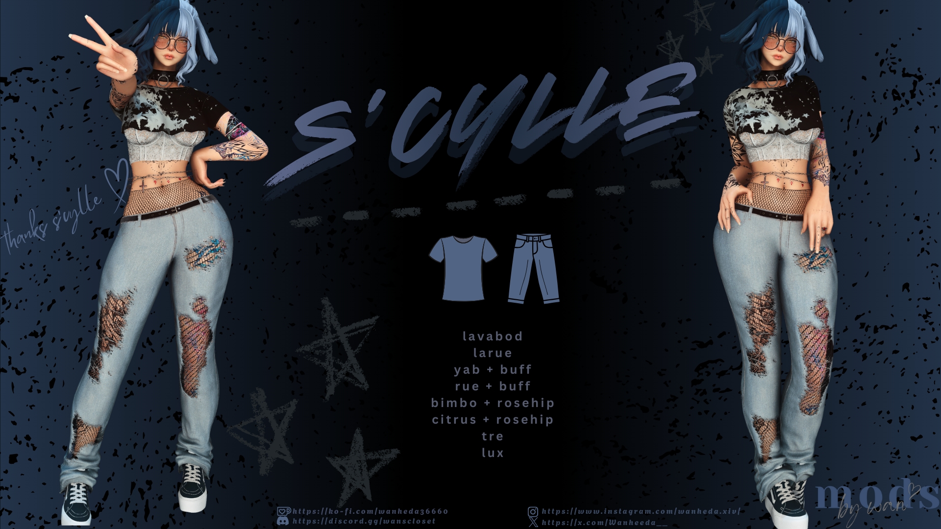female outfit - top | pants•··································································•✦ top sizes ✦┈• lavabod & larue • sugar | cupcake | teardrop | omoi┈• yab & rue • s | m | l + buff┈• bimbo & citrus • s | m | l | coconut┈• tre • s | m | l┈• lux✦ bottom sizes ✦┈• lavabod & larue┈• yab & rue • wc | sc | mini┈• bimbo & citrus + rosehip┈• tre┈• lux✦ info ✦┈• toggles: shirt | corset • fishnet | belt┈• piercing support┈• casual jacket | casual halfslops┈• requires yas - except lux┈• pants are fitted to fit most sneakers or converse shoes•··································································•disclaimer: all previews are taking with personal c+ scalingI couldn't find any issues whilst testing - please report bugs in my serverjoin my server for more releases :)•······················•✦ https://discord.gg/wanscloset ✦•······················•